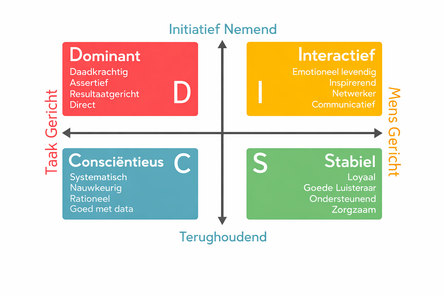 Als hulpmiddel gebruiken we ook de DISC-test. Hierdoor krijg je meer inzicht in je natuurlijke manier van communiceren, samenwerken en beslissingen nemen. De test zetten we meestal in tussen het eerste en tweede gesprek. Niet om je in een hokje te plaatsen, maar om te kijken of jouw voorkeursstijl past bij de dynamiek op de werkvloer.